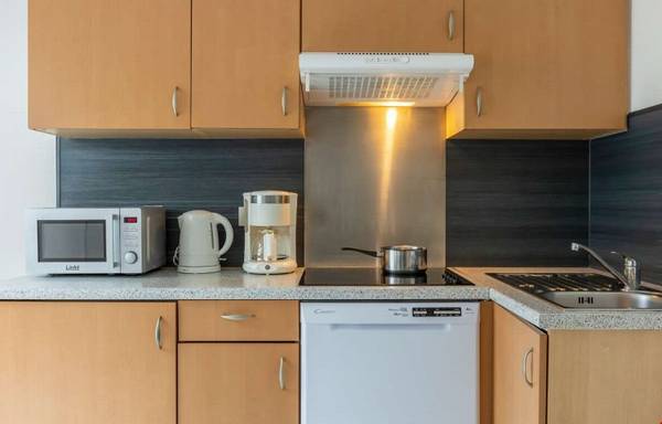- Fuldt udstyret tekøkken (keramisk kogeplade, køleskab, mikroovn med grillfunktion, opvaskemaskine)