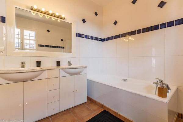 På etagerne: 4 værelser: det ene med 1 seng 140 og 1 seng 90, det andet med 1 seng 160, det tredje med 2 senge på 90 og det sidste med 1 seng 160. Dette værelse har forbindelse til et stort badeværelse med toilet.